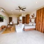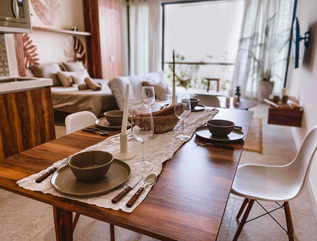 El desarrollo cuenta con 48 unidades residenciales distribuidas en tipologías de estudio y 1 recámara, pensadas tanto para vivir como para rentas vacacionales o estadías prolongadas. Los espacios están diseñados con distribuciones funcionales, iluminación natural y acabados cálidos en tonos tierra y madera, logrando interiores modernos con esencia caribeña.